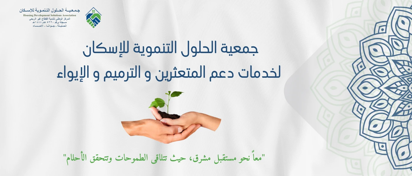 جمعية غير ربحية تهدف الى تطوير حلول تنموية في مجال الإسكان لرعاية الاسر المحتاجة وتأهيلهم ببرامح مبتكرة ودعم بموارد ومبادرات وشراكات وطنية مسؤولة.